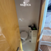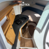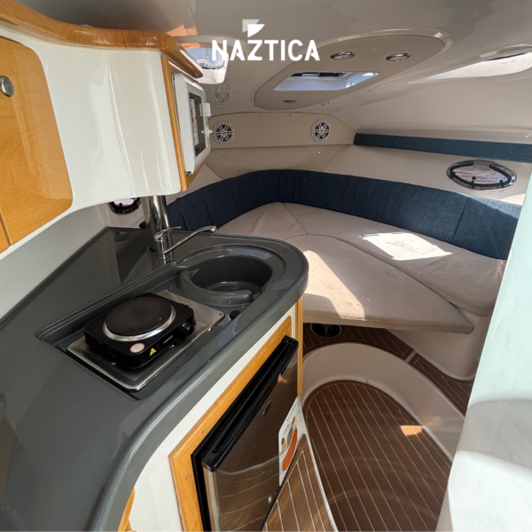 Interior con cocina living-comedor integrado, baño con inodoro eléctrico, vanitory con lavabo y duchador de mano y a popa, resguardando la privacidad que requiere, se encuentra la conejera con dos ojos de buey y colchonetas. Posee a proa dos ojos de buey, dos claraboyas y un tambucho de abrir que proporcionan óptimo ingreso de luz solar.